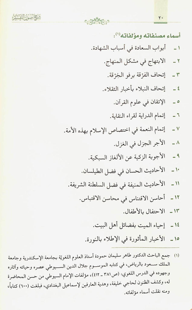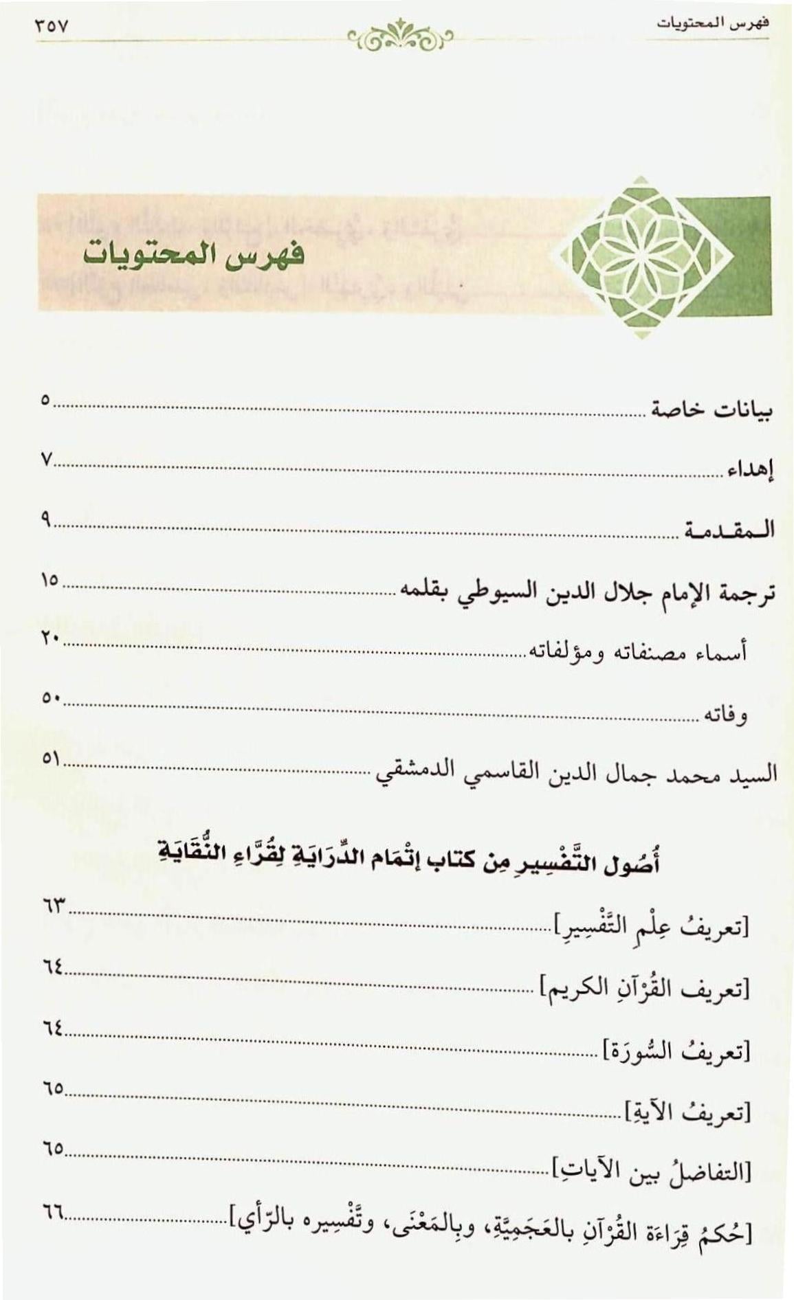 فهذه رسالة نفيسة في اصول التفسير للامام السيوطي المتوفى سنة 911 هـ وعليه شرح نفيس . والرسالة منتزعة من كتاب للمصنف اسمه النقاية وشرحه المرسوم بـ اتمام الدراية لقراء النقاية. والنقاية متن مختصر جمع فيه السيوطي خلاصة 14 عاما مع زبدة مسائلها، صنفه وهو 22 من عمره سنة 871 هـ. ثم شرحه وسماه اتمام الدراية لقراء النقاية . وكتابنا اليوم مجموع نفيس يحتوي على علم اصول التفسير متنا وشرحا للامام السيوطي مع تعليقات علامة الشام الشيخ جمال الدين القاسمي على متنه ويتخلله شرحه