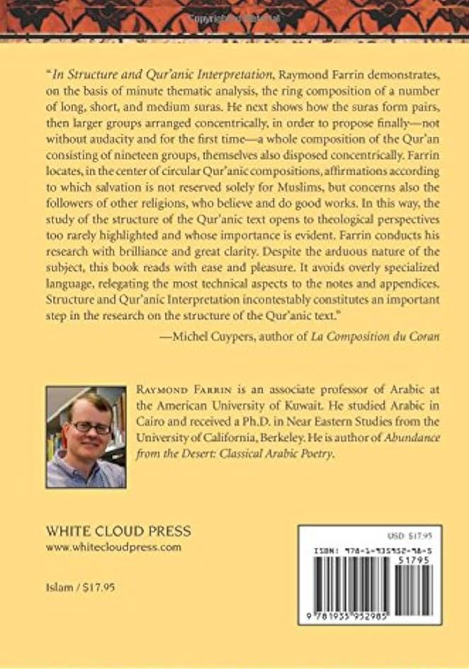 The Qur'an, Islam's holy book, is widely misunderstood because it is a difficult book to engage. The Qur'an is not written as a straightforward narrative like the Christian Gospels but is composed of discontinuous revelations that are often unclear in placing in an overall context. Structure and Qur’anic Interpretation , aimed both at readers familiar with the Qur’an and at those opening it for the first time, differs from other books on the Qur’an in that it reveals the text’s fundamental symmetrical organization. Moreover, through readings of key Qur'an chapters, Farrin shows how structure serves as a guide to interpretation. Indeed, one finds that the Qur’an’s structure again and again points to universal messages of an ethical nature, rather than to messages whose application may be limited to a specific context. In addition, the book makes a contribution to Qur’anic studies by highlighting literary evidence indicating that the Qur’an was compiled by one author (in all probability, the Prophet Muhammad) and not by an official committee.